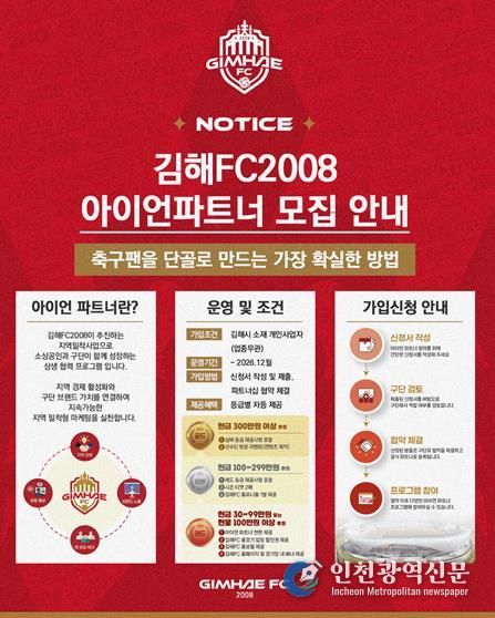 [인천광역신문] 최예준 기자 | 김해FC2008이 지역 상생 및 경제 활성화를 위한 프로젝트의 일환으로 소상공인과 구단이 함께 성장하는 상생 협력 프로그램‘아이언 파트너’를 모집한다고 밝혔다.