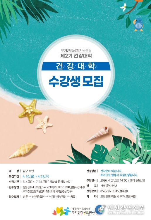 [인천광역신문] 최예준 기자 | 무거건강생활지원센터는 지역주민의 건강증진을 위한 ‘2026년 제2기 건강대학’ 수강생을 오는 20일부터 22일까지 모집한다고 14일 밝혔다.