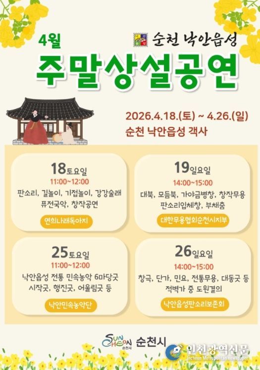 [인천광역신문] 최예준 기자 | 순천시는 오는 18일부터 주말과 공휴일에 순천 낙안읍성 객사에서 다채로운 주말상설공연을 개최한다고 밝혔다.