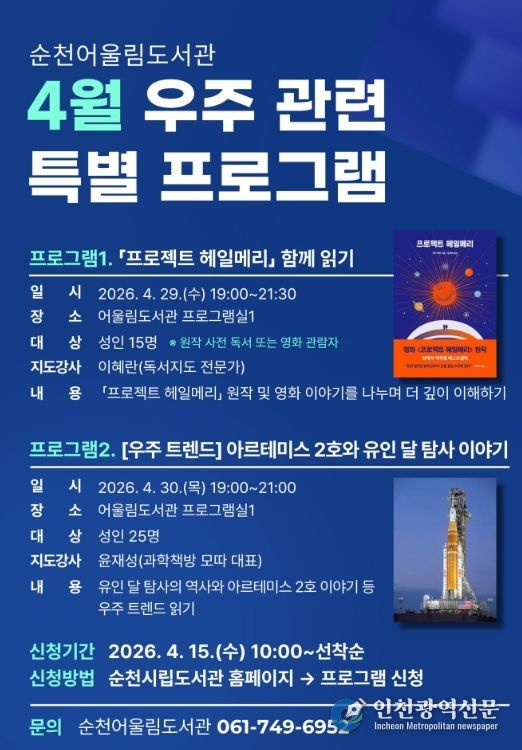 [인천광역신문] 최예준 기자 | 순천시는 과학의 달 4월을 맞아 어울림도서관의 우주항공 특성화 주제와 연계한 특별 프로그램을 운영한다고 밝혔다.
