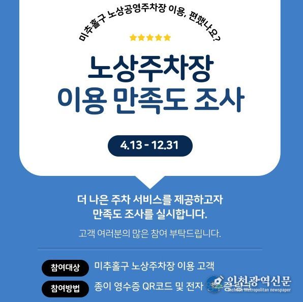 [인천광역신문] 최예준 기자 | 인천 미추홀구시설관리공단은 노상공영주차장 이용 고객의 다양한 의견을 수렴하고 서비스 품질을 향상하기 위해 ‘고객 만족도 조사’를 실시한다고 밝혔다.