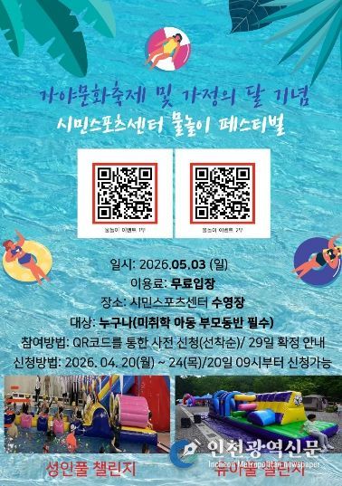 [인천광역신문] 최예준 기자 | 김해문화관광재단 시민스포츠센터는 오는 5월 3일, 김해시 대표 축제인 ‘가야문화축제’와 ‘가정의 달’을 기념하여 시민들을 위한 특별한 물놀이 이벤트를 개최한다고 밝혔다.