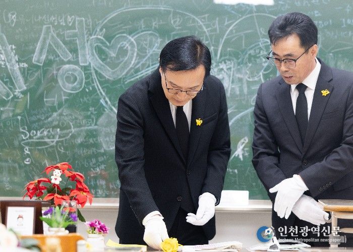 방문단은 추모 영상 시청 후 희생자들의 넋을 기리며 묵념했다. 이어 기억교실을 찾아 책상에 총 261송이의 국화를 일일이 헌화하며 참사의 의미를 되새겼다.