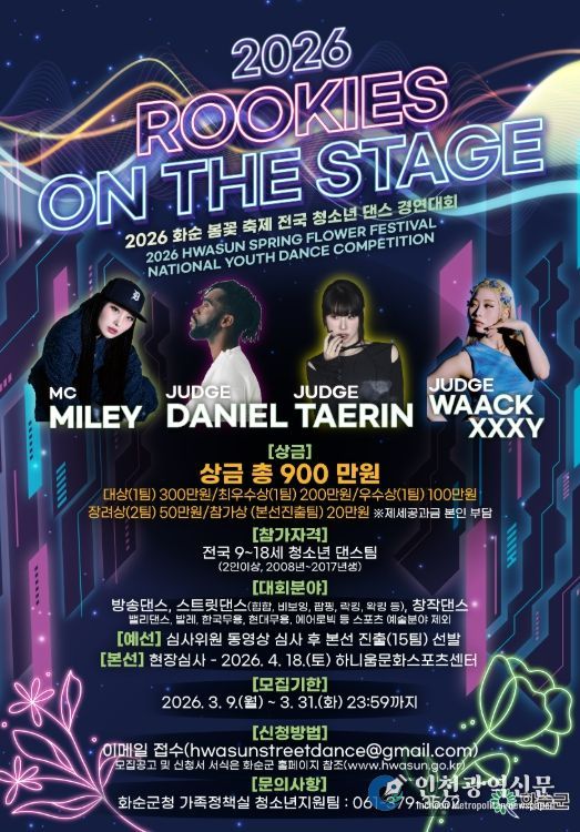 [인천광역신문] 최예준 기자 | 화순군은 오는 4월 18일 '2026 화순 봄꽃 축제'의 화려한 시작을 알리는 ‘제3회 전국 청소년 댄스 경연 대회’ 본선을 개최한다고 밝혔다.