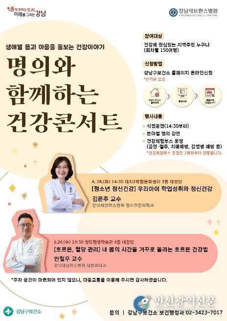[인천광역신문] 최예준 기자 | 꿈이 모이는 도시, 미래를 그리는 강남구가 4월부터 10월까지 ‘명의와 함께하는 건강 콘서트’를 총 4회 운영한다. 이번 건강 콘서트는 강남세브란스병원과 삼성서울병원 의료진이 참여해 청소년 정신건강, 호르몬 건강, 치매예방, 유방암 관리 등 주민 관심이 높은 주제를 다룬다.