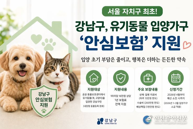 [인천광역신문] 최예준 기자 | 꿈이 모이는 도시, 미래를 그리는 강남구가 서울시 자치구 가운데 처음으로 유기동물 입양가구에 ‘안심보험’을 지원한다. 특히, 이 사업은 서울시가 2023년까지 추진했던 유기동물 입양보험 지원이 중단된 뒤, 입양가구의 수요를 반영해 자치구 차원에서 다시 보험 지원을 이어가는 첫 사례라는 점에서 의미가 있다.