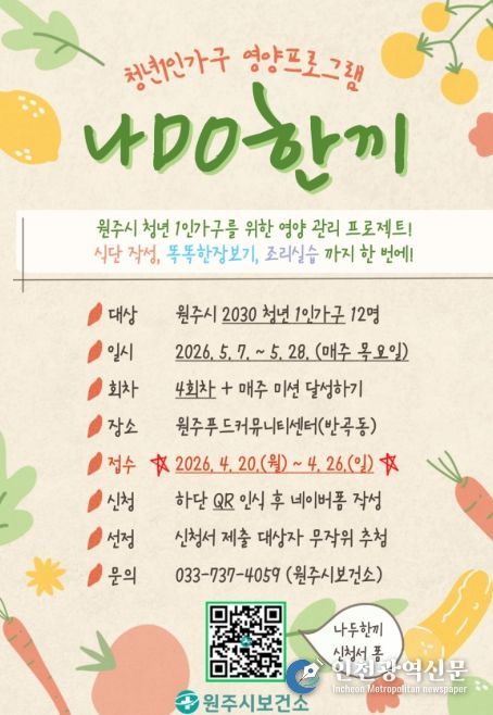 [인천광역신문] 최예준 기자 | 원주시보건소는 관내 2030 청년 1인 가구의 건강한 식생활 자립을 위한 영양관리 프로그램 ‘나DO한끼’ 참여자를 모집한다.