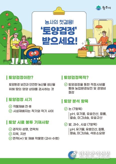 [인천광역신문] 최예준 기자 | 원주시농업기술센터는 과학적인 토양관리와 지속 가능한 농업환경 조성을 위해 종합검정실에서 토양·퇴비·액비에 대한 정밀검정 서비스를 제공하고 있다.