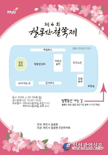 [인천광역신문] 최예준 기자 | 파주시 월롱면이 주최하고 월롱면 주민자치회가 주관하는 ‘제4회 월롱산 철쭉제’가 오는 4월 25일부터 26일까지 이틀간 월롱시민공원(월롱면 덕은리 산 134-1, 월롱배수지)에서 개최된다.