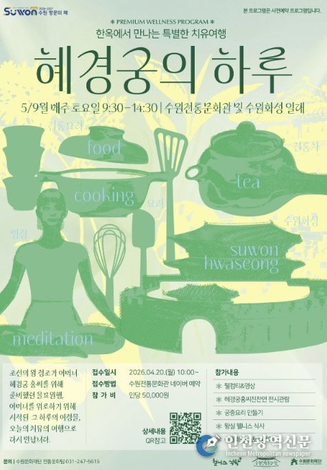 [인천광역신문] 최예준 기자 | 수원문화재단은 오는 5월과 9월, 수원전통문화관에서 프리미엄 웰니스 프로그램 ‘한옥에서 만나는 특별한 치유여행 : 혜경궁의 하루’를 운영한다.