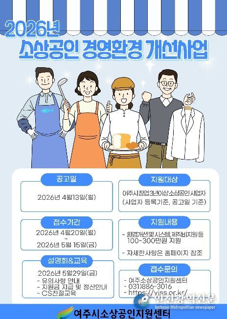 [인천광역신문] 최예준 기자 | 여주시소상공인지원센터는 여주시 소상공인의 경영환경 개선과 사업 경쟁력 강화를 위해 '2026년 소상공인 경영환경 개선사업'을 추진한다고 밝혔다.