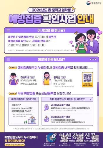 중학교 입학 전에는 ▲일본뇌염 ▲Tdap 6차 ▲HPV 1차(여학생) 접종을 완료해야 한다.