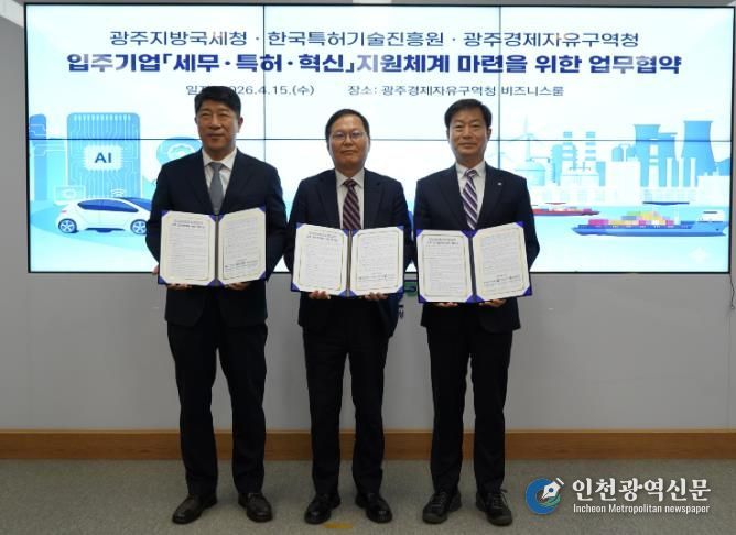 [인천광역신문] 최예준 기자 | 광주경제자유구역청은 15일 경자청 비즈니스룸에서 광주지방국세청, (재)한국특허기술진흥원과 ‘광주경제자유구역 핵심 전략산업 기업 육성 및 기술 경쟁력 강화를 위한 업무협약’을 체결했다.