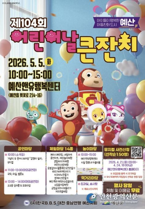 [인천광역신문] 최예준 기자 | 예산군은 제104회 어린이날을 맞아 5월 5일 오전 10시부터 오후 3시까지 예산앤유행복센터에서 어린이날 기념행사를 개최한다.
