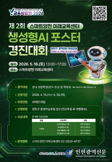 먼저 스마트양천 미래교육센터에서는 ‘생성형 AI 포스터 경진대회’가 열린다. 관내 초등학교 저학년(1~3학년) 학생과 학부모가 2인 1팀으로 참여해 ‘양천구, 움직이는 미래교실’을 주제로 생성형 인공지능(AI)을 활용한 포스터를 제작하고 발표한다. AI 활용 역량은 물론 창의력과 발표 능력을 함께 키울 수 있도록 구성됐으며 총 13팀(26명)을 모집한다.