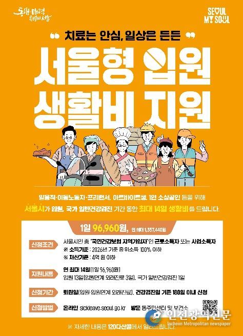 신청은 ‘서울형 입원 생활비 지원’ 누리집을 통해 온라인으로 가능하며, 거주지 관할 동 주민센터 또는 구 보건소 방문 신청도 가능하다. 신청 기한은 퇴원일 또는 건강검진일로부터 180일 이내다. 자세한 사항은 구 보건소 누리집 ‘사업안내-의료비 지원사업’ 게시판에서 확인할 수 있다.