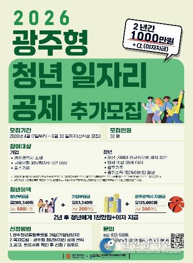 [인천광역신문] 최예준 기자 | 광주광역시는 지역 청년의 자산 형성과 장기근속을 지원하기 위한 ‘광주형 청년 일자리 공제사업’ 참여자 30명을 4월17일부터 6월30일까지 추가 모집한다.