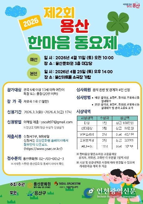 [인천광역신문] 최예준 기자 | 서울 용산구가 4월 25일 토요일 오후 2시, 용산아트홀 소극장 가람(녹사평대로 150)에서 ‘제2회 용산 한마음 동요제’를 개최한다.