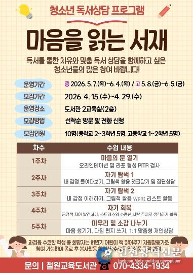 [인천광역신문] 최예준 기자 | 철원교육도서관(관장 김민서)은 5월 7일부터 6월 5일까지 2교육실에서 중·고생 10명을 대상으로 청소년 독서 상담·교육봉사 ‘나1너2(나읽너들)’ 프로그램을 운영한다.