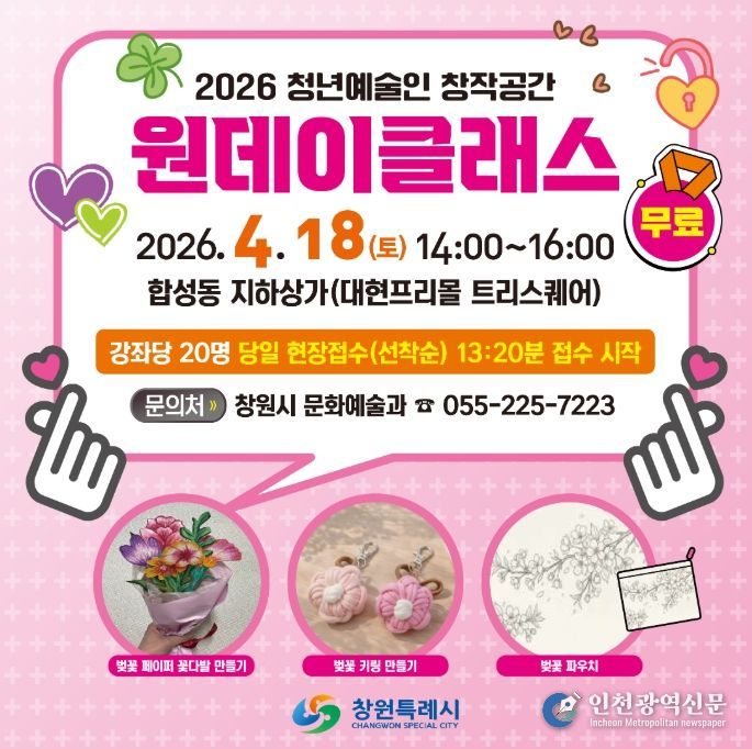 [인천광역신문] 최예준 기자 | 창원특례시는 오는 4월 18일 토요일 오후 2시부터 4시까지 마산회원구 합성동 지하상가 트리스퀘어에서 ‘청년예술인 창작공간 지원사업 상가 연계 벚꽃 원데이클래스’를 개최한다고 밝혔다.