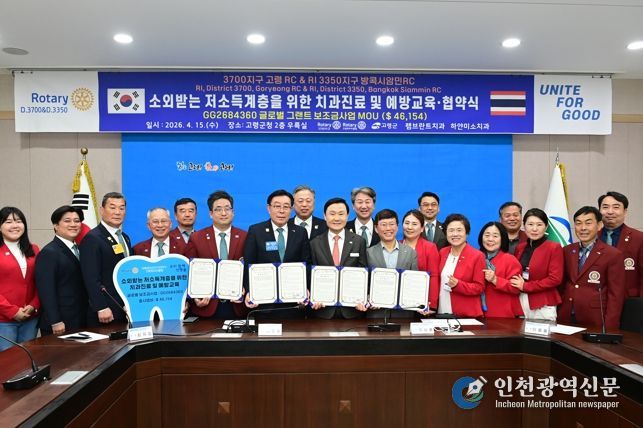 [인천광역신문] 최예준 기자 | 고령군과 국제로타리 3700지구 고령로타리클럽(회장 최유승)은 4월 15일, 고령군청에서 관내 저소득 취약계층의 구강 건강 증진을 위한 ‘치과진료 및 예방교육 사업’업무 협약을 체결했다.