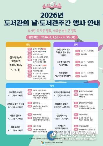 [인천광역신문] 최예준 기자 | 경상북도교육청 봉화도서관은 2026년 도서관의 날·도서관주간을 맞이하여 4월 12일부터 '도서관 속 작은 펼침, 세상을 여는 큰 열림'이라는 주제로 다양한 독서 문화 프로그램을 운영하고 있다.