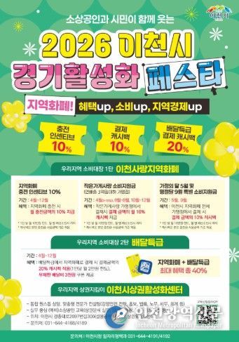 [인천광역신문] 최예준 기자 | 이천시가 지난 4월 3일부터 연말까지 추진 중인 ‘2026 이천시 경기활성화 페스타’가 시민들의 뜨거운 호응 속에 지역화폐 이용 소비 증가로 이어지며 지역경제에 큰 활기를 불어넣고 있다.