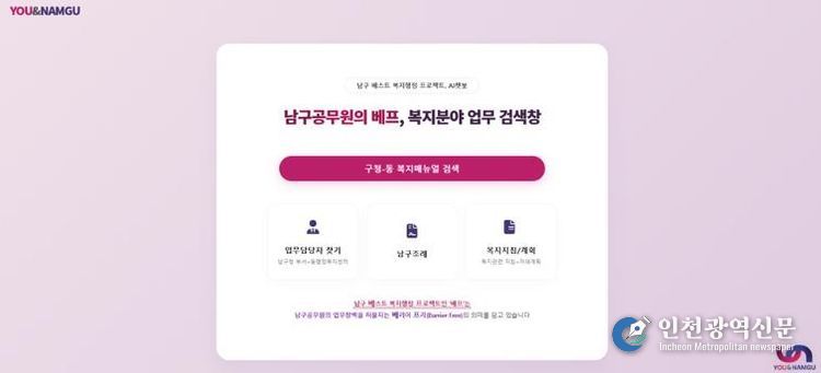 [인천광역신문] 최예준 기자 | 부산 남구는 복지행정의 업무 효율성을 높이고 민원 응대 품질을 개선하기 위해 남구 베스트 복지행정 프로젝트인 ‘베프 AI챗봇’을 4월 중 구축하고 시범운영을 시작했다고 밝혔다.