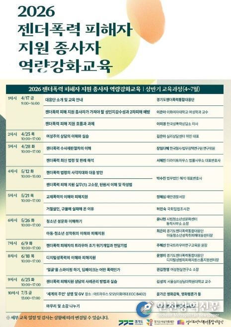 [인천광역신문] 최예준 기자 | 경기도와 경기도젠더폭력통합대응단이 17일 도내 젠더폭력 피해 지원 현장 종사자들의 전문성 향상을 위한 ‘2026 역량강화 교육’ 상반기 과정을 시작하며 현장 대응력 강화에 나섰다.
