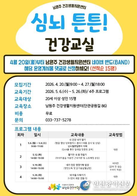 [인천광역신문] 최예준 기자 | 남원주건강생활지원센터는 심뇌혈관질환의 이해·예방과 건강관리를 돕기 위해 5월 6일부터 26일까지 ‘심뇌 튼튼! 건강교실’을 운영한다.