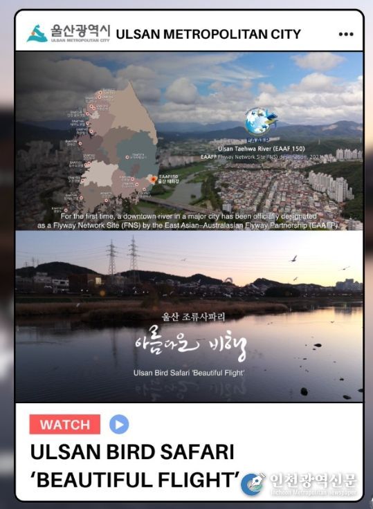 [인천광역신문] 최예준 기자 | 울산시는 ‘울산 조류사파리’홍보영상이 국제철새기구 공식관계망(채널)을 통해 전 세계에 소개되며 세계적(글로벌) 생태도시 울산 알리기가 본격 시작됐다고 밝혔다.