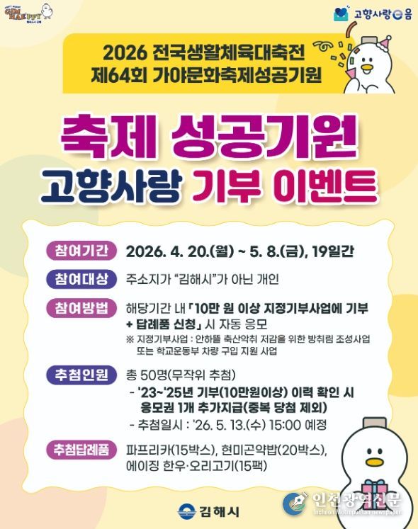 [인천광역신문] 최예준 기자 | 김해시는 대규모 체육·문화 행사의 성공적 개최를 기원하고 지역의 시급한 현안을 해결하는 지정기부 사업을 널리 알리기 위해 20일부터 5월 8일까지 19일간 ‘고향사랑 기부 혜택 플러스’ 이벤트를 실시한다.