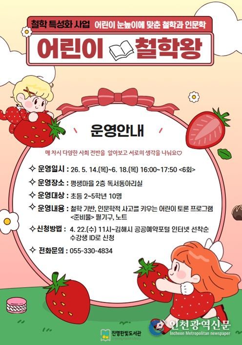 [인천광역신문] 최예준 기자 | 김해시 진영한빛도서관은 오는 5월부터 어린이의 사고력과 표현력 증진을 위한 철학 특성화 프로그램 ‘어린이 철학왕’을 운영한다고 17일 밝혔다.