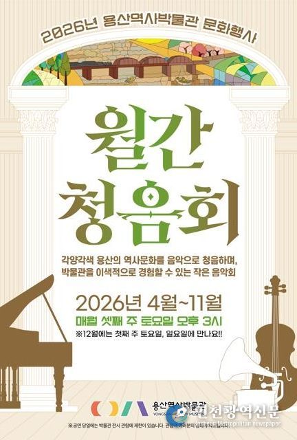 [인천광역신문] 최예준 기자 | 서울 용산구가 이달부터 11월까지 매월 셋째 주 토요일, 12월은 첫째 주 토요일과 일요일 오후 3시에 용산역사박물관(한강대로14길 35-29) 로비에서 작은 음악회 ‘월간 청음회’ 문화 행사를 개최한다.