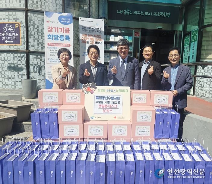[인천광역신문] 최예준 기자 | 의정부시 장암동주민센터는 4월 16일 물댄동산수림교회가 부활절을 맞아 지역 내 어려운 이웃을 위해 ‘기쁨나눔선물 세트’와 마스크 50상자를 기탁했다고 밝혔다.