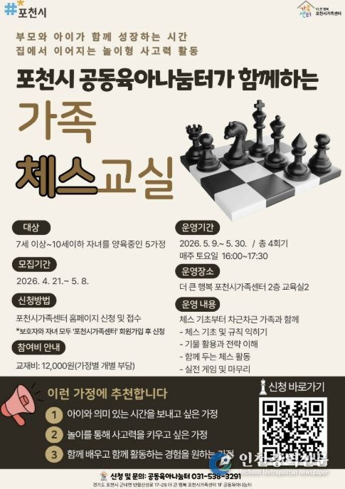 [인천광역신문] 최예준 기자 | 포천시 더 큰 행복 포천시가족센터는 공동육아나눔터 상시 프로그램의 일환으로 아동의 논리적 사고력 향상과 부모-자녀 간 긍정적 상호작용을 지원하기 위해 가족 참여형 체스 프로그램 '가족 체스 교실'을 운영한다고 밝혔다.