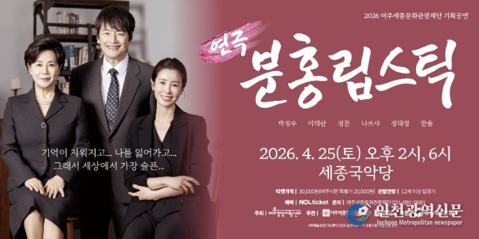 [인천광역신문] 최예준 기자 | 여주세종문화관광재단이 오는 4월 25일, 예술경영지원센터의 공모사업인 '공연예술 지역 유통지원 사업'의 일환으로 베테랑 배우들이 참여한 창작 연극‘분홍립스틱’을 세종국악당에서 개최한다.