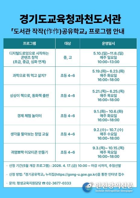 [인천광역신문] 최예준 기자 | 경기도교육청과천도서관이 학생들의 자기주도 학습 역량과 창의적 사고력 함양을 위해 ‘도서관 작작(作作) 공유학교’를 운영한다.