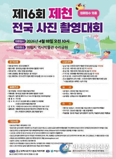 [인천광역신문] 최예준 기자 | 충북 제천의 대표적인 명승지 의림지에서 전국의 사진 작가들이 한데 모여 찰나의 예술을 겨루는 축제의 장이 펼쳐진다. 사단법인 한국사진작가협회 제천지부(지부장 김서윤)는 오는 4월 18일(토) 오전 10시, 제천 의림지 수리공원에서 ‘제16회 제천전국사진촬영대회’를 개최한다고 밝혔다.