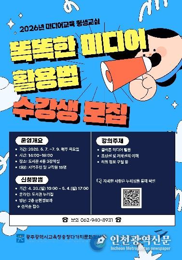 [인천광역신문] 최예준 기자 | 광주시교육청송정다가치문화도서관은 오는 5월 7일부터 7월 9일까지 ‘2026년 미디어교육 평생교실’을 운영한다.