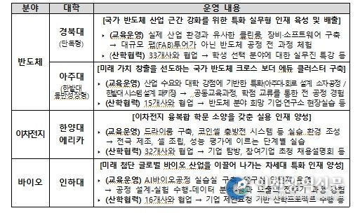 이번 성과교류회는 첨단산업 특성화대학의 특성화 전공 운영, 다각적 기업 협업, 학사 운영 개선 등 성공 사례를 확산하기 위하여 마련됐다. 올해는 경북대(반도체 단독형), 아주대(반도체 동반성장형), 한양대 에리카(이차전지), 인하대(바이오) 등 4개 대학이 우수 성과를 발표한다.