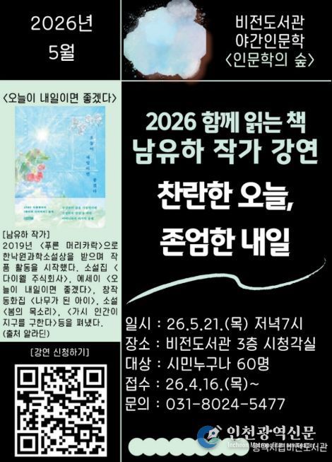 [인천광역신문] 최예준 기자 | 평택시립 비전도서관은 오는 5월 21일 저녁 7시 남유하 작가를 초청하여 ‘찬란한 오늘, 존엄한 내일’을 주제로 야간 인문학 강연을 진행한다.