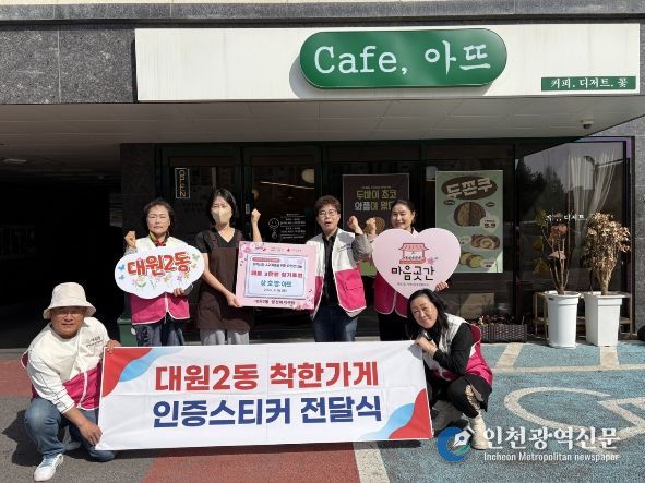 [인천광역신문] 최예준 기자 | 오산시 대원2동은 지난 16일 지역 내 카페 ‘아뜨’를 ‘착한날개(착한가게)’ 14호점으로 지정하고 인증스티커를 전달했다고 밝혔다.