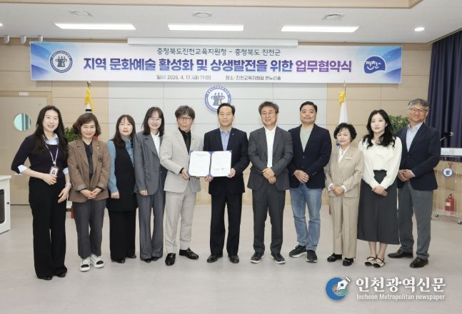 [인천광역신문] 최예준 기자 | 충북 진천군과 진천교육지원청은 17일 진천교육지원청 온누리홀에서 ‘지역 문화예술 활성화와 상생발전’을 위한 업무협약을 체결했다고 밝혔다.