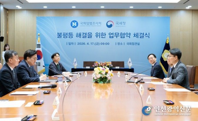 [인천광역신문] 최예준 기자 | 국세청은 2026년 4월 17일 국회의장 주재로 국회입법조사처와 불평등 해결을 위한 행정데이터 활용 협력 강화를 목적으로 업무협약(MOU)을 체결했다.
