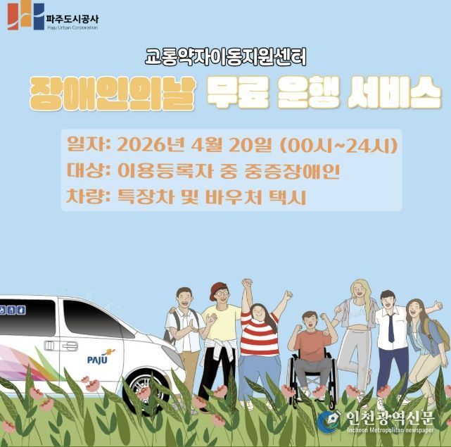 [인천광역신문] 최예준 기자 | 파주도시공사 교통약자이동지원센터에서는 오는 4월 20일 장애인의 날을 맞아 교통약자를 위한 무료 운행 서비스를 실시한다.