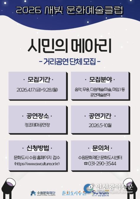 [인천광역신문] 최예준 기자 | 수원문화재단은 지역 공연예술의 활성화와 수원시민의 주체적 문화예술 참여를 위해 ‘새빛 문화예술클럽 '시민의 메아리'’ 사업에 참여할 생활예술단체를 모집한다.