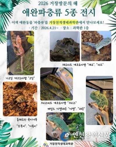 [인천광역신문] 최예준 기자 | 거창군은 거창천적생태과학관에서 2026년 ‘거창방문의 해’를 맞아 오는 21일부터 어린이와 학생, 가족 관람객을 대상으로 이색 애완 파충류 전시를 개최한다고 밝혔다.