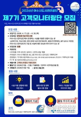 [인천광역신문] 최예준 기자 | 여수시도시관리공단은 시민 참여를 기반으로 공단 시설과 서비스 품질을 점검하고 개선하기 위한 '2026년 제7기 고객모니터링단'을 모집한다고 밝혔다.
