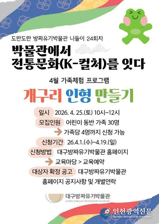 [인천광역신문] 최예준 기자 | 대구문화예술진흥원 박물관운영본부 소속 대구방짜유기박물관은 화창한 봄날 4월에 전통공예 가족체험과 팔공산 역사문화 이해 특강을 기획하여, 4월 25일 오전 10시에 ‘개구리 인형 만들기’ 체험을, 4월 28일 오후 2시에 ‘고려 태조 왕건 후백제 견훤과 팔공산’ 강의를 개최한다.